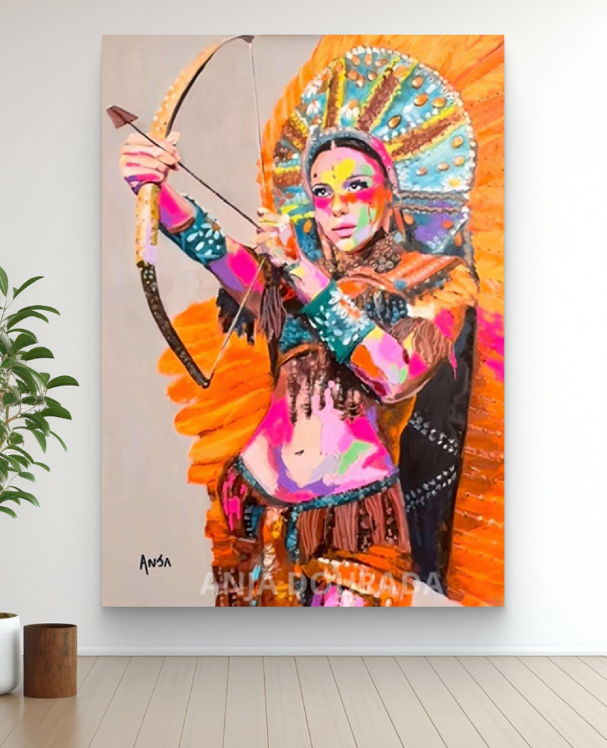 Quadro decorativo Modelo "A GUERREIRA DAS CORES", da artista Anja Dourada. Apresenta uma pintura acrílica de uma mulher guerreira com arco e flecha, cocar e pinturas corporais em cores vibrantes (tons de rosa, laranja e azul).