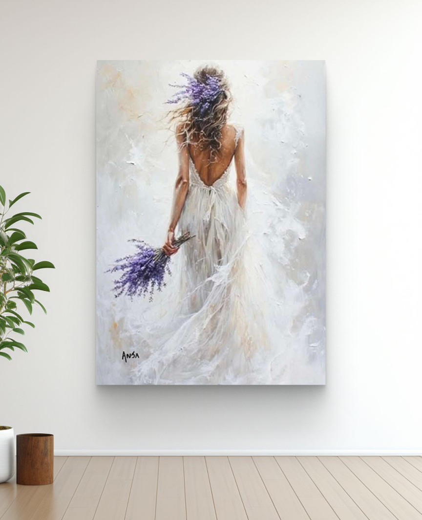 Quadro decorativo Modelo "PERFUME DE LAVANDA", da artista Anja Dourada. Apresenta uma pintura acrílica de uma mulher vista de costas, usando um vestido branco e segurando um buquê de lavanda.