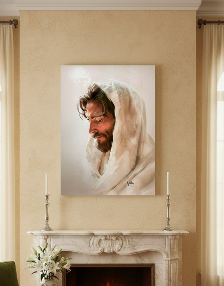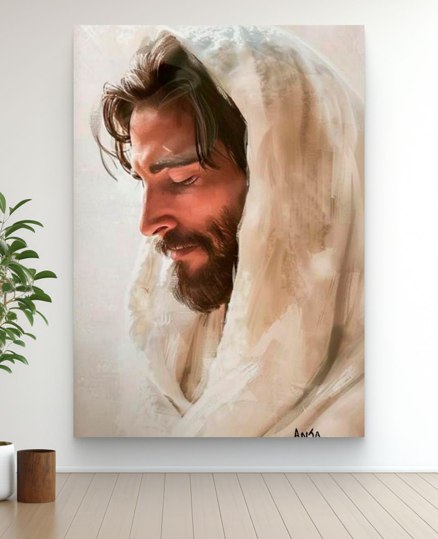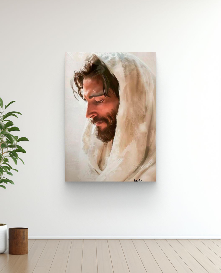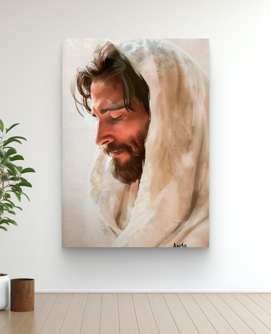 Quadro decorativo Modelo "A FACE DO AMOR", da artista Anja Dourada. Apresenta uma pintura acrílica delicada do rosto de Jesus de perfil, coberto por um manto branco, transmitindo paz e serenidade.