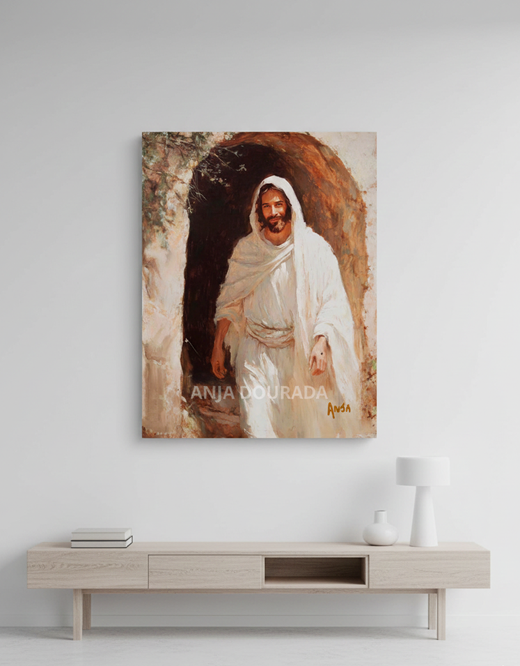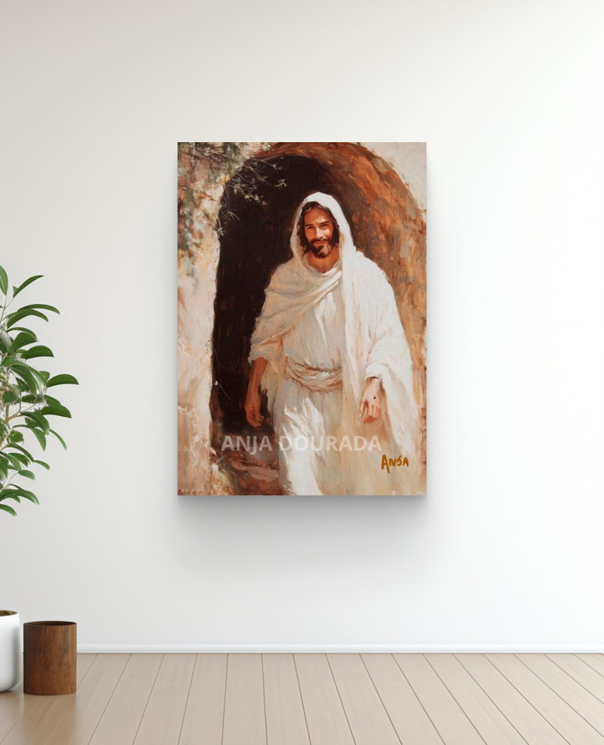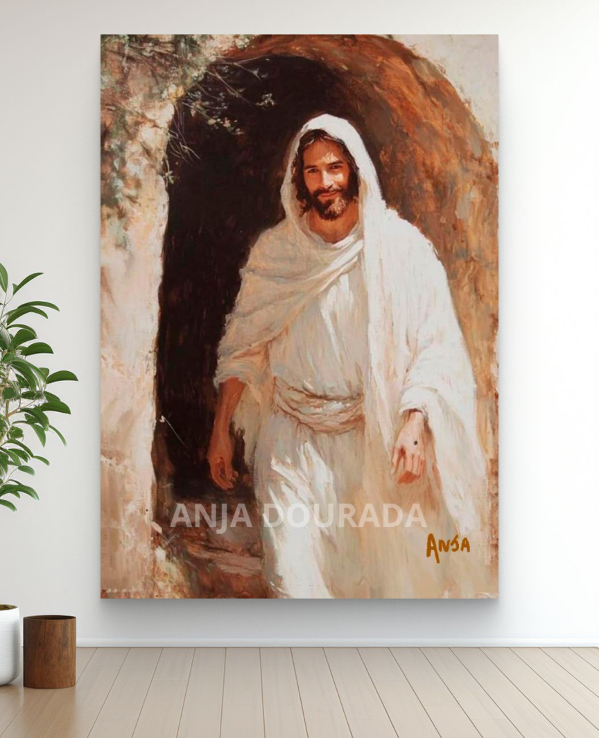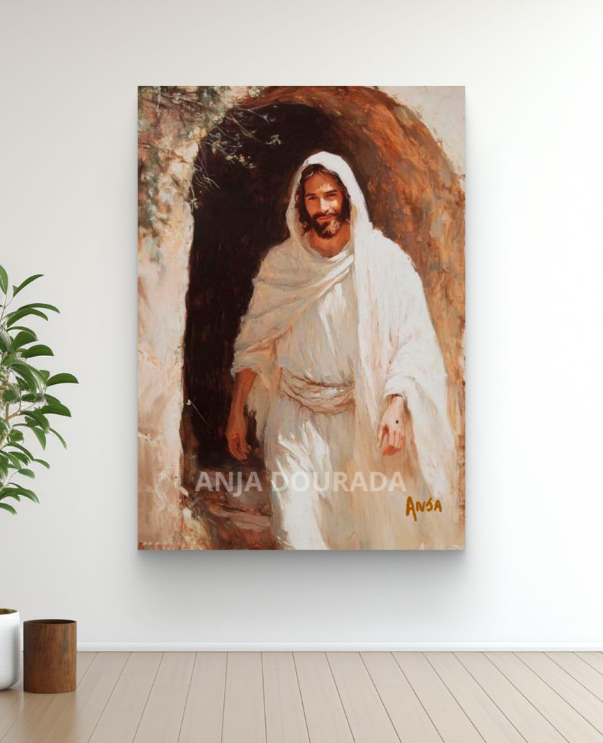 Quadro decorativo Modelo "A VOLTA DA ESPERANÇA", da artista Anja Dourada. Apresenta uma pintura acrílica emocionante de Jesus Cristo saindo do sepulcro, simbolizando a ressurreição e o renascimento.