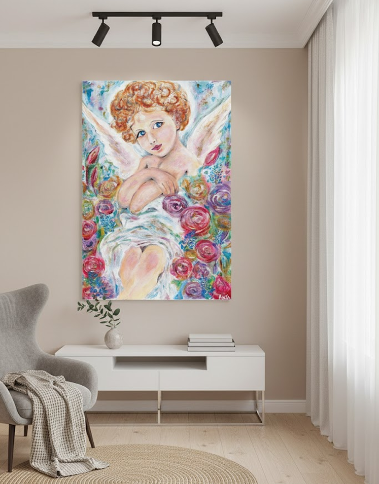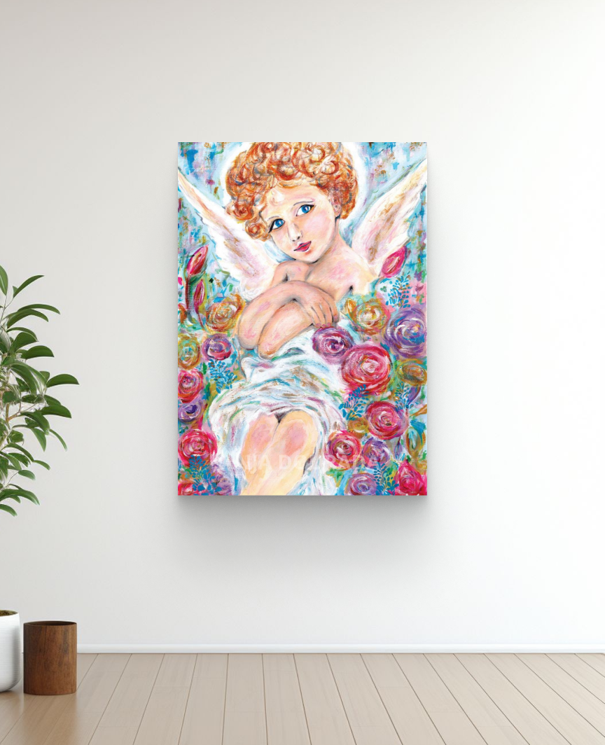 Quadro decorativo Modelo "ANJINHO HUGO", da artista Anja Dourada. Apresenta uma pintura acrílica encantadora de um anjo com cabelos cacheados e olhos azuis expressivos, envolto em um jardim de rosas coloridas que transmitem alegria e doçura.