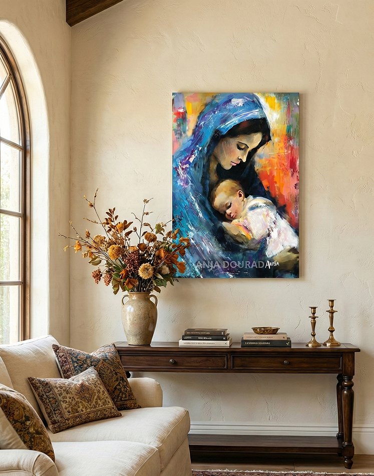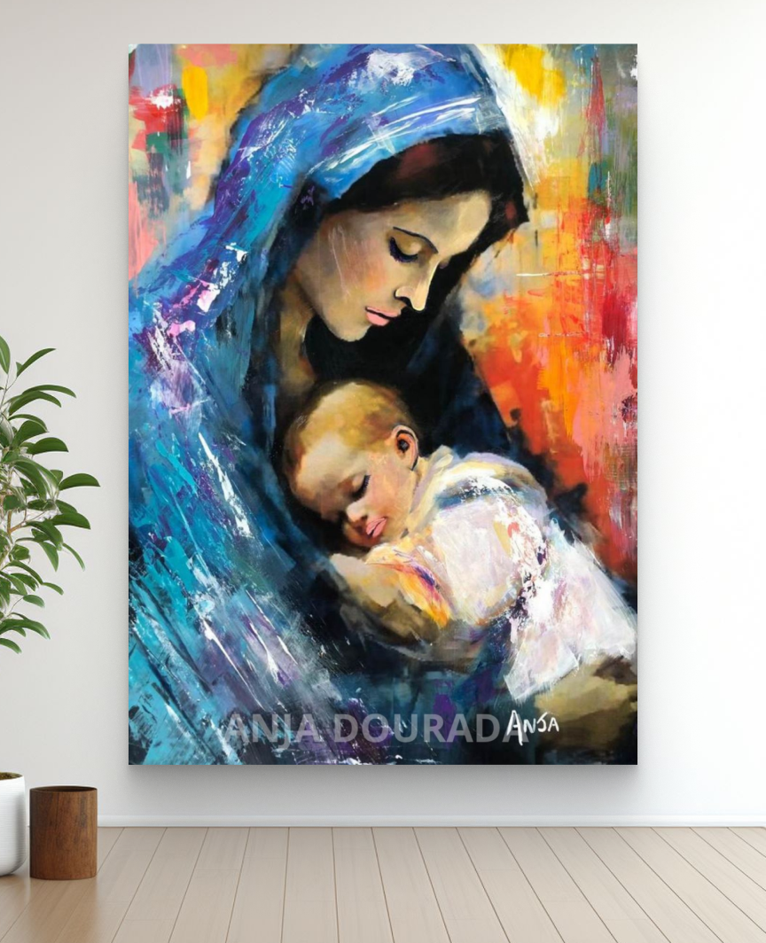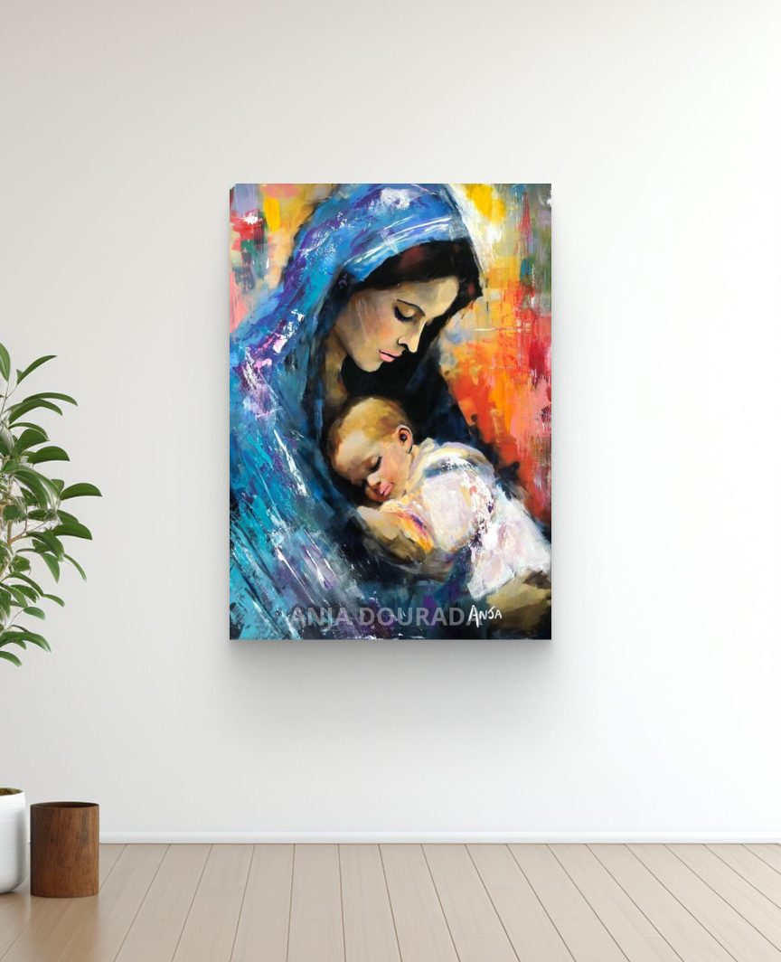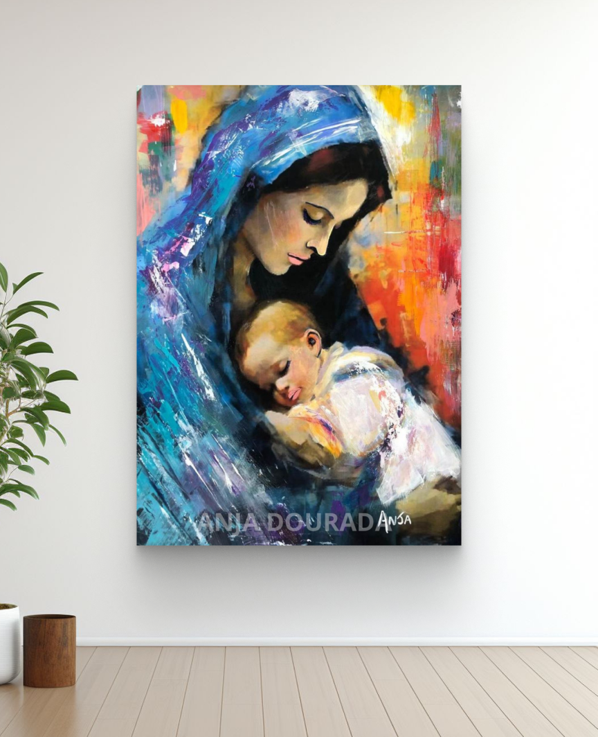 Quadro decorativo Modelo "DOCE PROTEÇÃO", da artista Anja Dourada. Apresenta uma pintura acrílica vibrante e emotiva de Maria envolvendo o menino Jesus em um abraço protetor, com um manto azul intenso contrastando com um fundo abstrato e colorido.