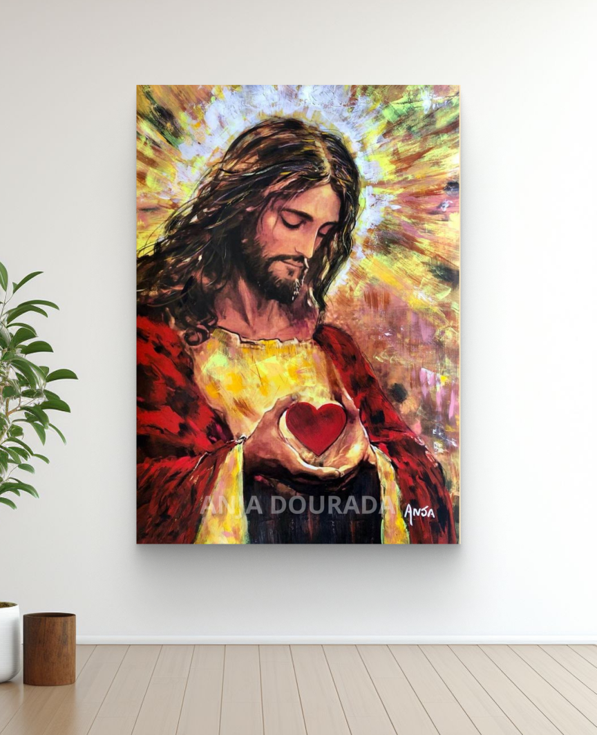 Quadro decorativo Modelo "O CORAÇÃO DE JESUS", da artista Anja Dourada. Apresenta uma pintura acrílica vibrante de Jesus segurando um coração vermelho, com o peito iluminado por uma luz divina.