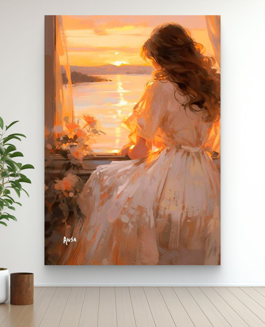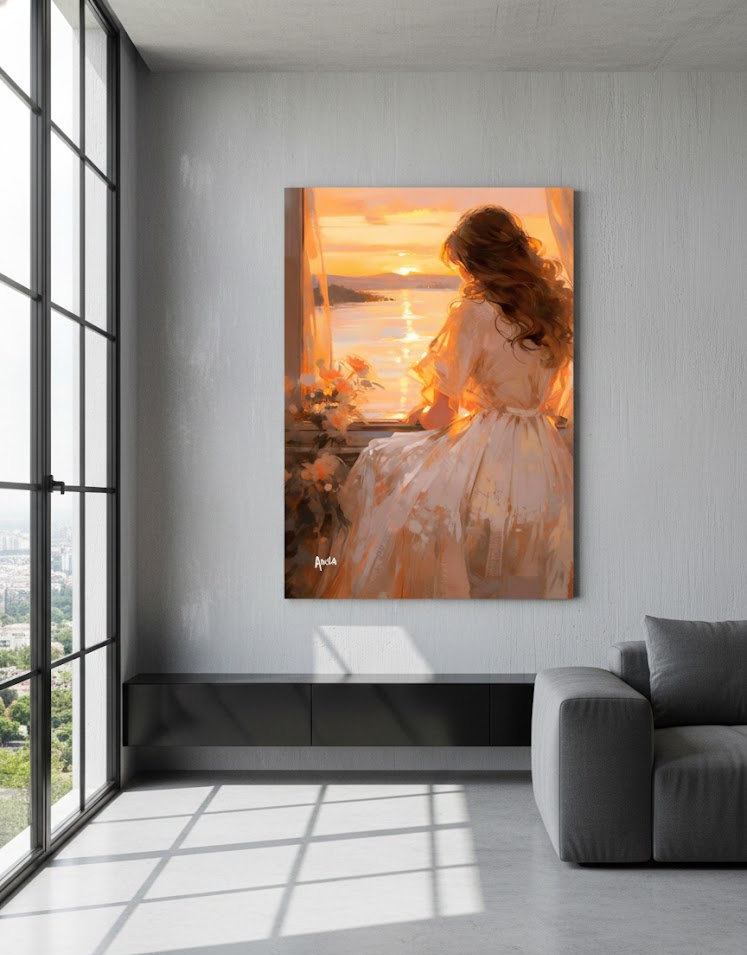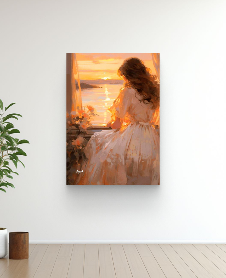 Quadro decorativo Modelo "TARDE DE SOL", da artista Anja Dourada. Apresenta uma pintura acrílica de uma mulher sentada em uma janela, observando o pôr do sol sobre a água.